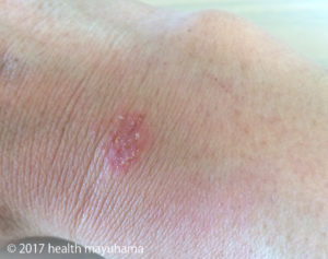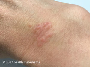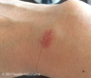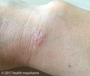 最初はアレルギー反応だろうとたかをくくっていましたが、いっこうに治る気配を見せず、ぷっくりとかさぶた化しています。かゆみもあります。